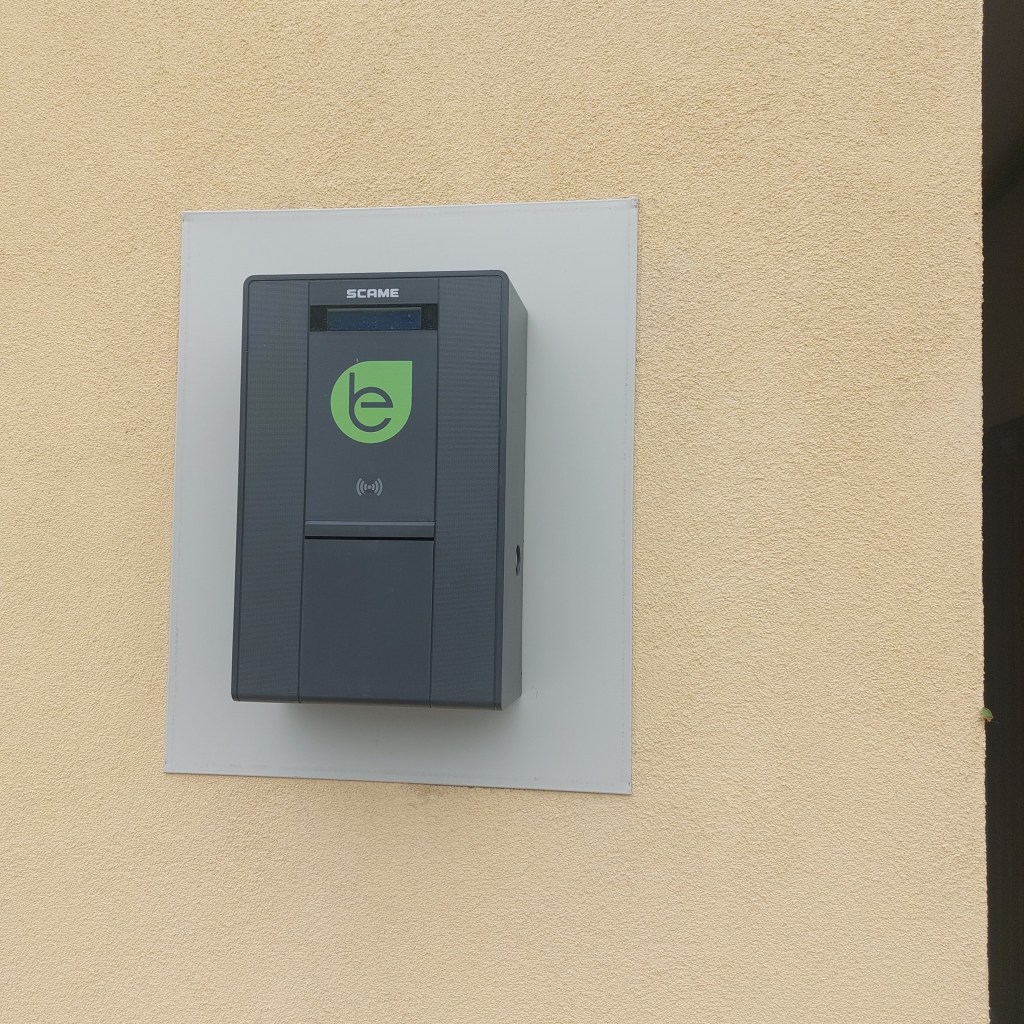 E’ stato installato un punto di ricarica autoveicoli, posizionato al piano carrabile sul retro del condominio. Del tipo a muro, permette la ricarica delle batterie del veicolo elettrico sfruttando dapprima l’energia accumulata nello storage, per poi prelevare normalmente dalla rete pubblica