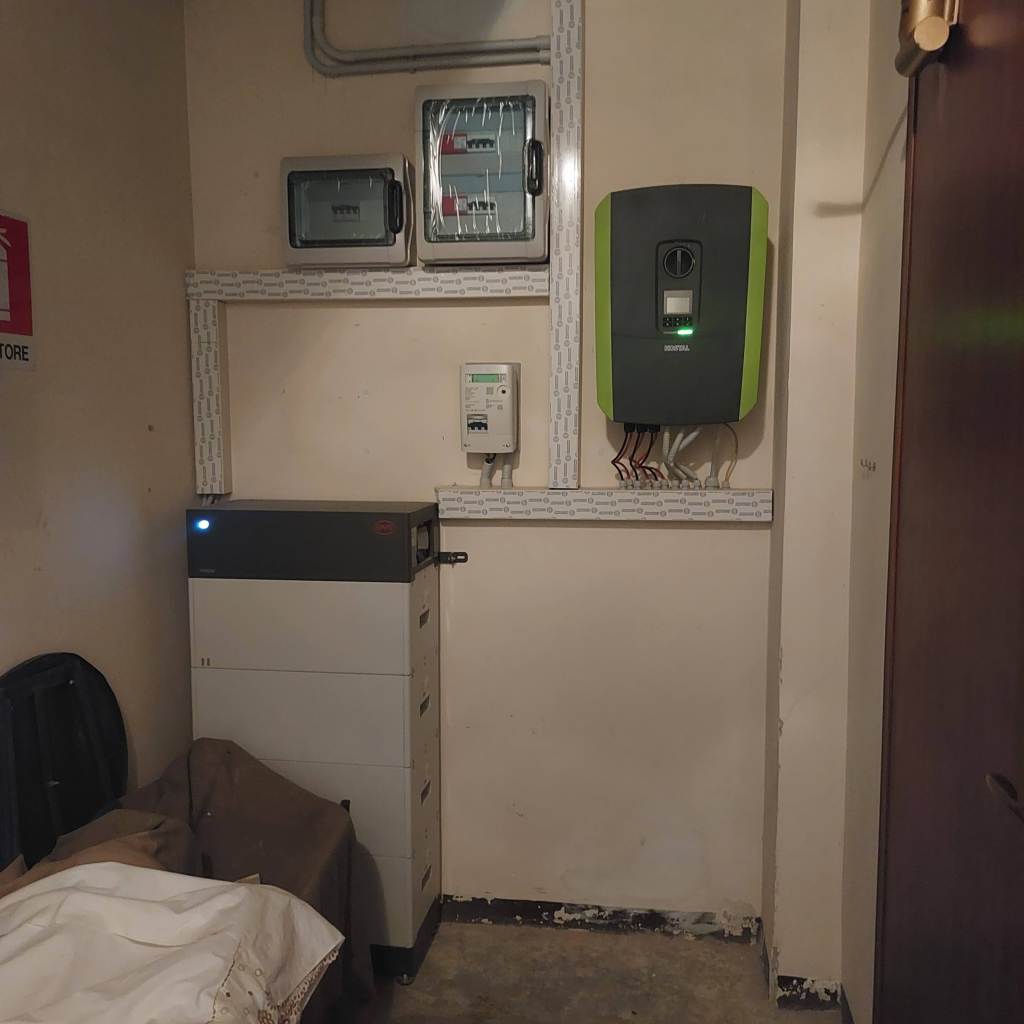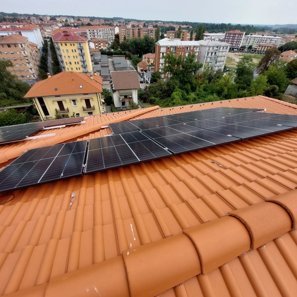 Il campo fotovoltaico (FV) trova spazio sulla copertura del tetto in aderenza alle tegole, esposto nel modo migliore sotto il profilo dell’irraggiamento. L’impianto prevede una potenza di picco pari a 7,2 KW. Nuovi quadri elettrici e inverter hanno trovato posto in una zona parti comuni del condominio. Pratica GSE a conclusione del tutto.