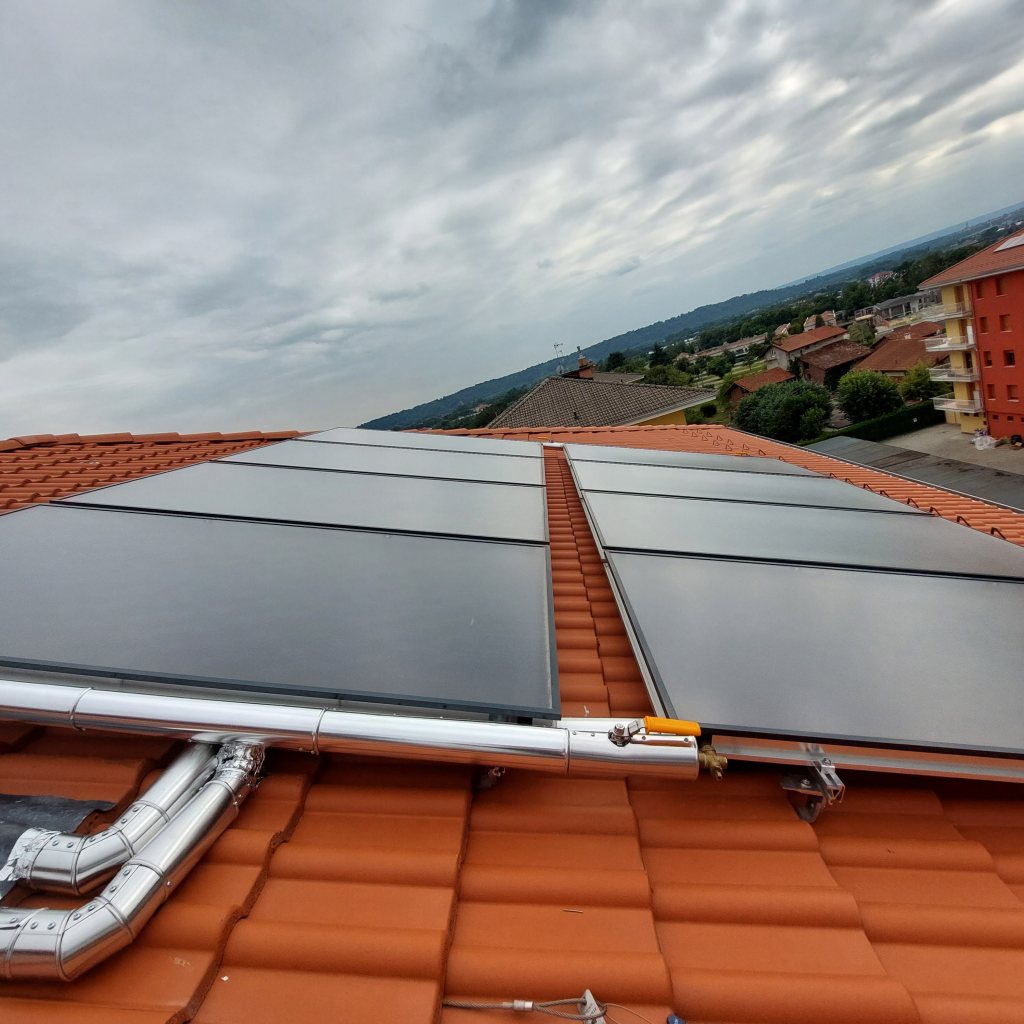 Sono stati installati n°8 pannelli solari, ad integrazione dell’energia termica prodotta dal generatore di calore. Sono installati sulla falda di tetto esposta nel modo migliore sotto il profilo dell’irraggiamento, in aderenza alle tegole. La struttura di sostegno sarà ancorata alle tramezze dei muri delle cantine nel sottotetto, in modo da non gravare sul manto di copertura il cui scenario strutturale risulta, pertanto, immutato. L’energia prodotta dai collettori è indirizzata all’integrazione della produzione di acqua calda sanitaria.