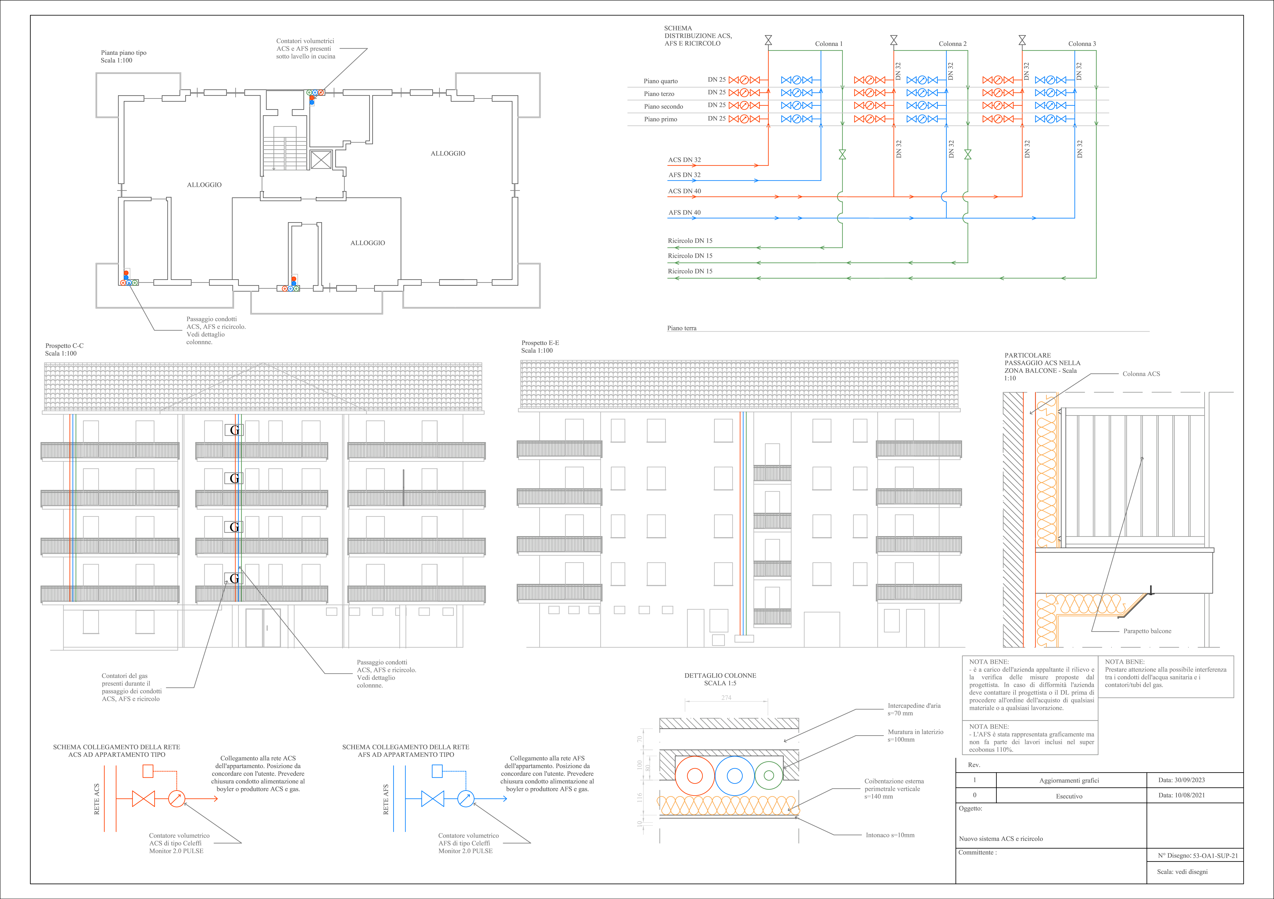 La potenza della caldaia è pari a 104 KW (pertanto l’attività non rientra tra quelle soggette a controllo da parte dei VVFF di cui all’elenco del DPR 151/2011). La PdC ha potenza pari a 42 KW, meno della metà della caldaia, in ossequio ai dettami del super Ecobonus del 110%. La PdC è posizionata nel cortile di proprietà del condominio, per mascherarla e renderla compatibile è stata immaginata all’interno di un involucro metallico di colore rosso come la parete dell’immobile.