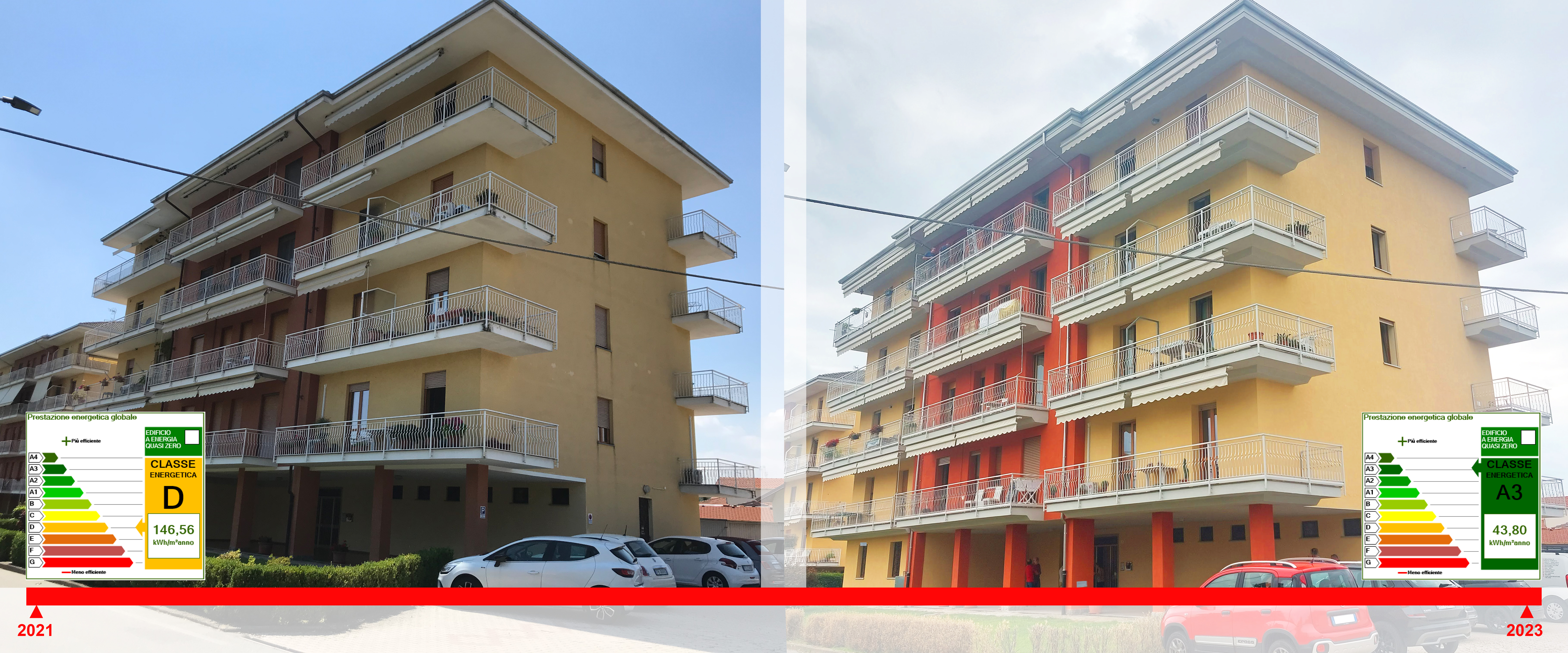 Sono state coibentate le strutture opache dell’edificio per una superficie totale maggiore al 25% rispetto alla superficie disperdente complessiva. Sono stati interessati i muri disperdenti perimetrali verticali di tutto l’edificio e del sottotetto. Le facciate dell’edificio presentavano dei motivi che l’architetto ha ritenuto di voler riproporre anche in fase post-operam, in quanto davano un senso di classicità e di eleganza all’immobile.