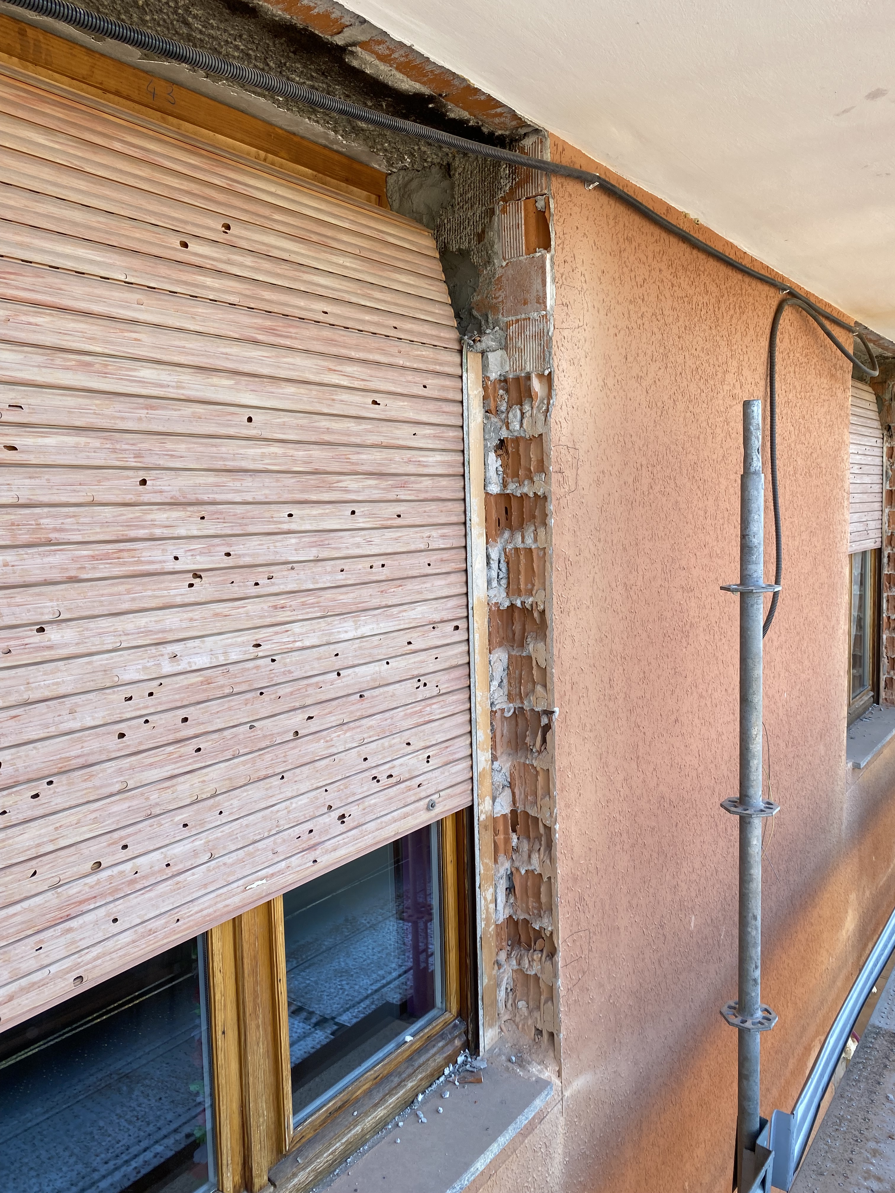 In ottemperanza ai dettami del quadro legislativo presente relativo all’installazione delle schermature solari, sono state installate tende esterne a protezione della superficie vetrata. Tali oggetti sono applicati in modo solidale all’involucro edilizio. Il colore delle tende è stato scelto simile alla coloritura della muratura dei decori e nella maggior parte dei casi l’effetto che appare è un’estensione del balcone.